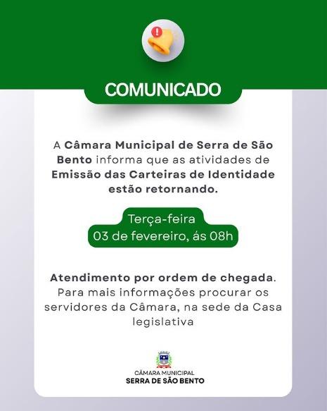 A Câmara Municipal de Serra de São Bento tem o prazer de anunciar o retorno das atividades de Emissão das Carteiras de Identidade nesta terça-feira, 3 de fevereiro, a partir das 8h.